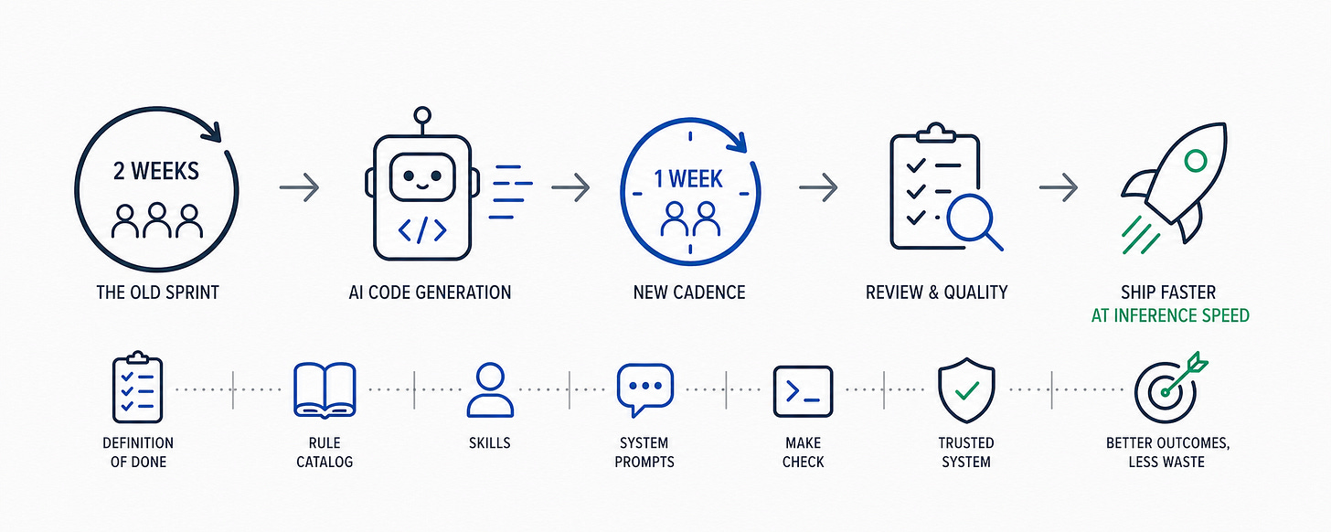 How is AI impacting software teams? Teams compress (2–4 humans), sprints compress (one week), and the team’s attention shifts from grooming a backlog to reviewing what the agents produced and maintaining the rules that decide which of it is worth keeping.